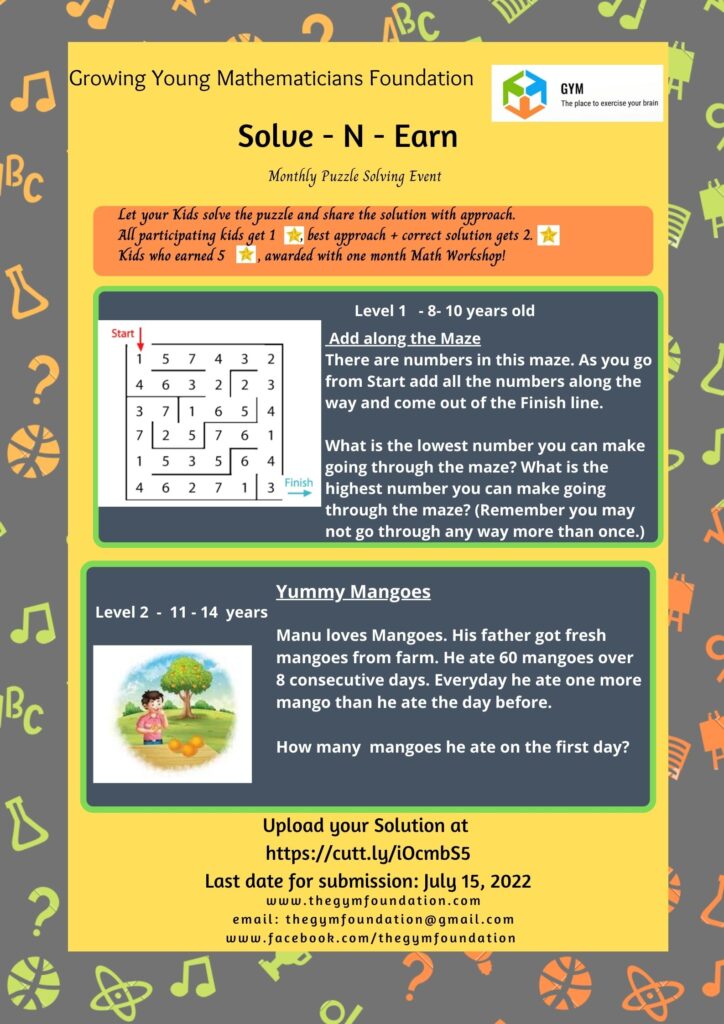 Solve N Earn July Month Winners Level 1 8 - 10 years old Meera Sriram, Chennai Level 2 11 - 14 years old Sanjana K, ChennaiHansini Krishna, Chennai